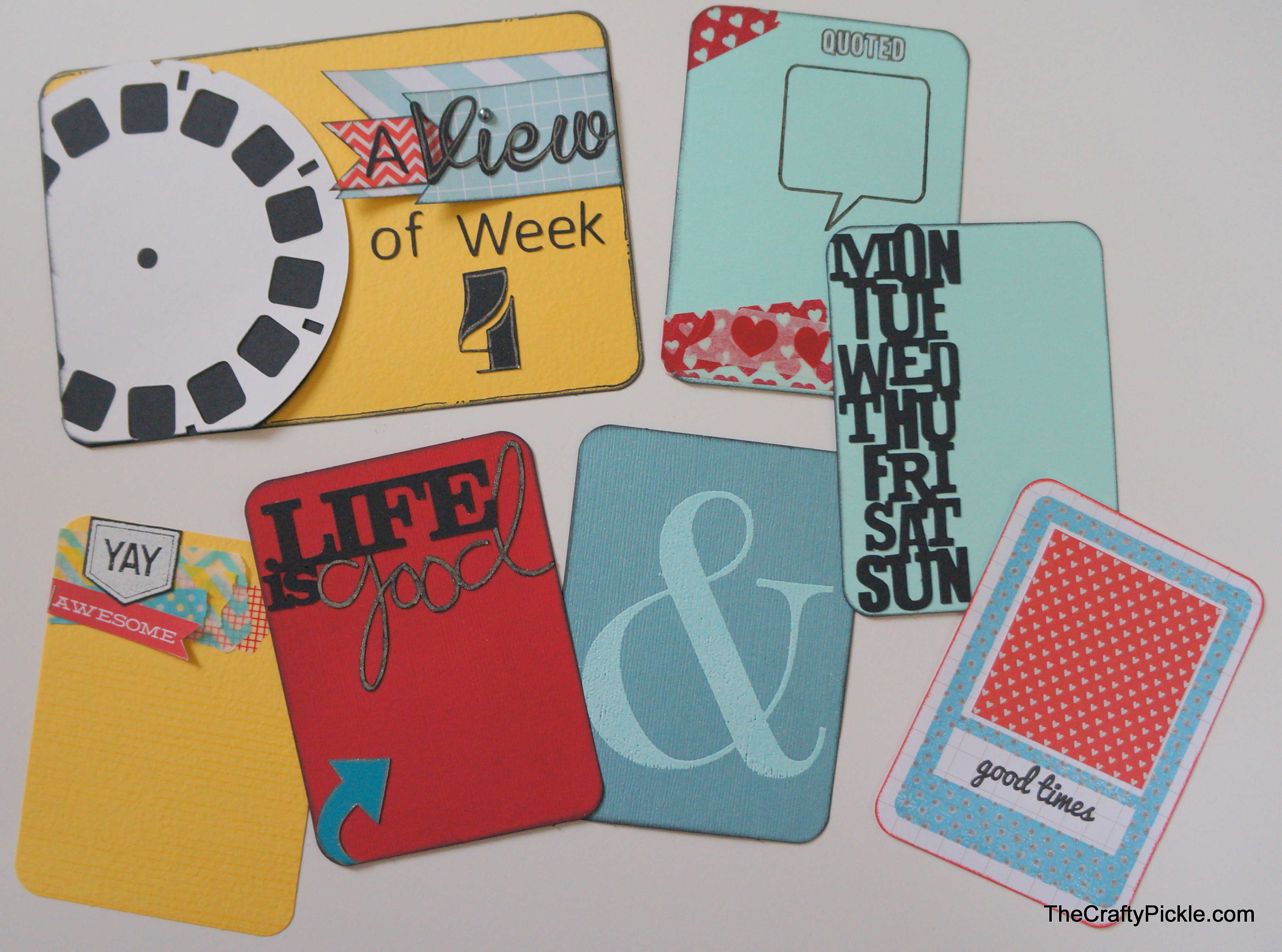 Happy Wednesday! Here I am again with this week’s hand made project life cards. This batch is for my February swap partner (she loves aqua and peacocks). I ended up liking the viewmaster weekly card so much that I made one for my week 4 (which is the one pictured) I included a bunch of cut out numbers for her card so she could use it for any week she would like. I think I might try slipping some index size prints in the viewmaster die cut, something I will try at the end of the week.