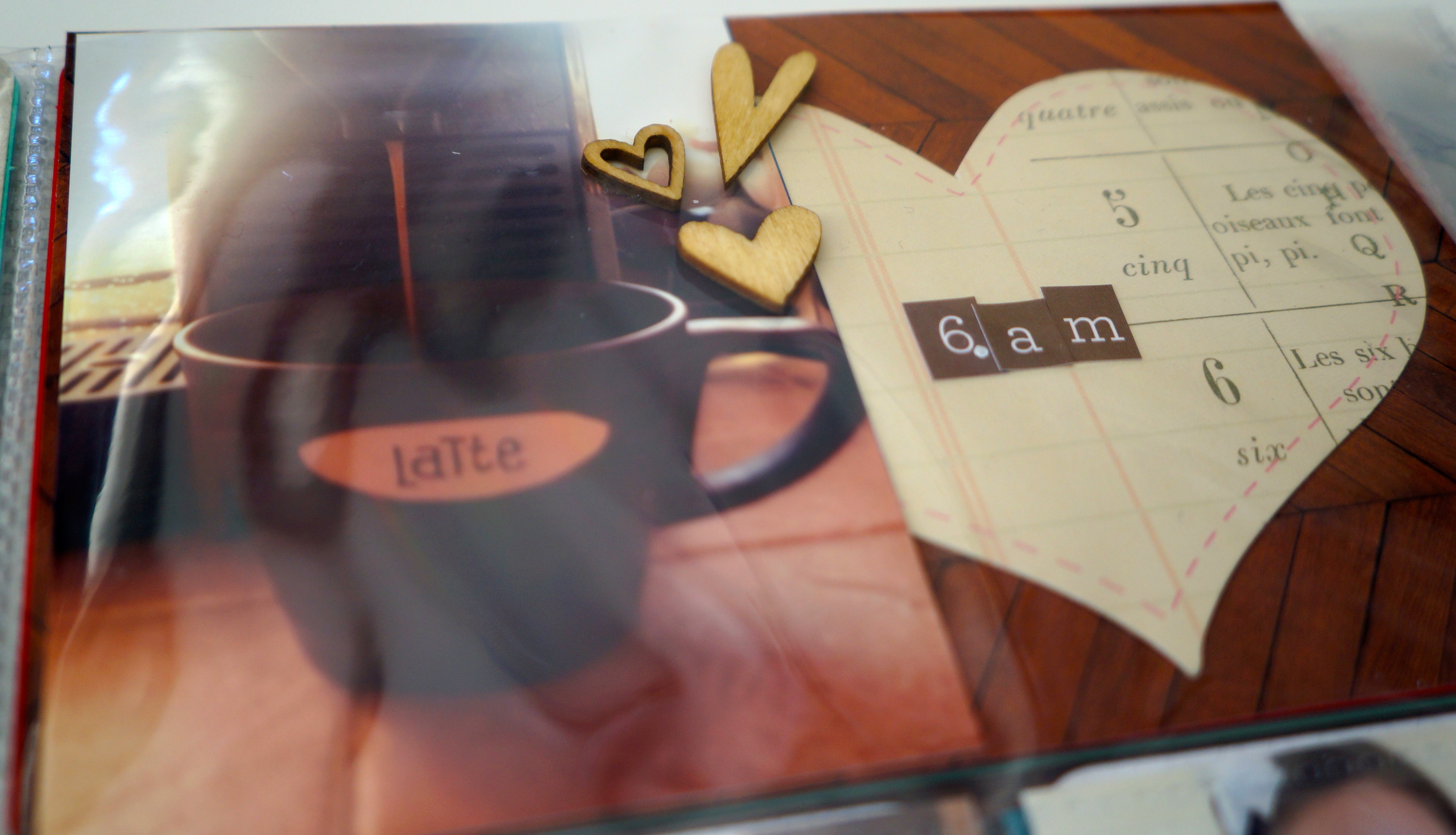 I am one of those girls who needs her cup of coffee first thing in the morning before anything else. Once my alarm goes off I go straight to the coffee maker and then wake the kids. I wanted to stay simple with my photo and figured no journaling was needed beyond “6am”. I love these little wood veneer hearts from Studio Calico and Freckled Fawn (I pulled hearts from the two different packs I had).