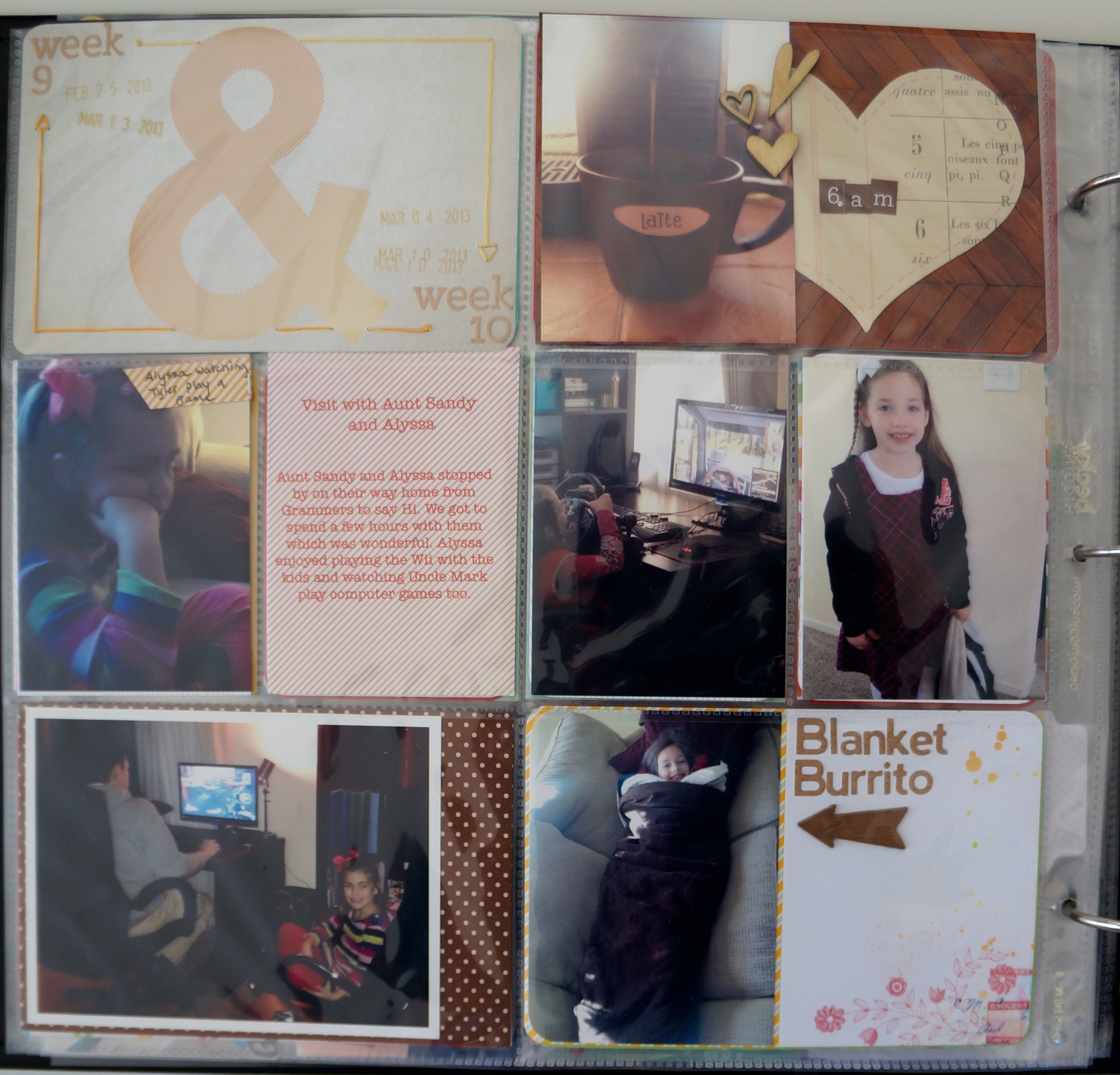 So I didn’t have a lot of photos for either weeks 9 or 10 so I thought I would just combine the two weeks into one spread. I think it came together pretty well. I anticipate that this might happen again though the year. Its nice to know I don’t have to try to cram in a bunch of extra stuff to fill up a two page spread just for the sake of doing a two page spread every week.