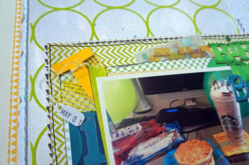 I am working this layout within my project life album but I really wanted to capture one of our favorite traditions in my family, The Birthday Breakfast! On May 1st my oldest son turned 14 (I can hardly believe it, the time really goes by so very fast) and he requested his favorite starbucks frappachino and a waffle ice cream sandwich (hey waffles is a breakfast food, right? LOL) I also have to add that this is his favorite place to be, his computer desk. so it was the perfect set up.