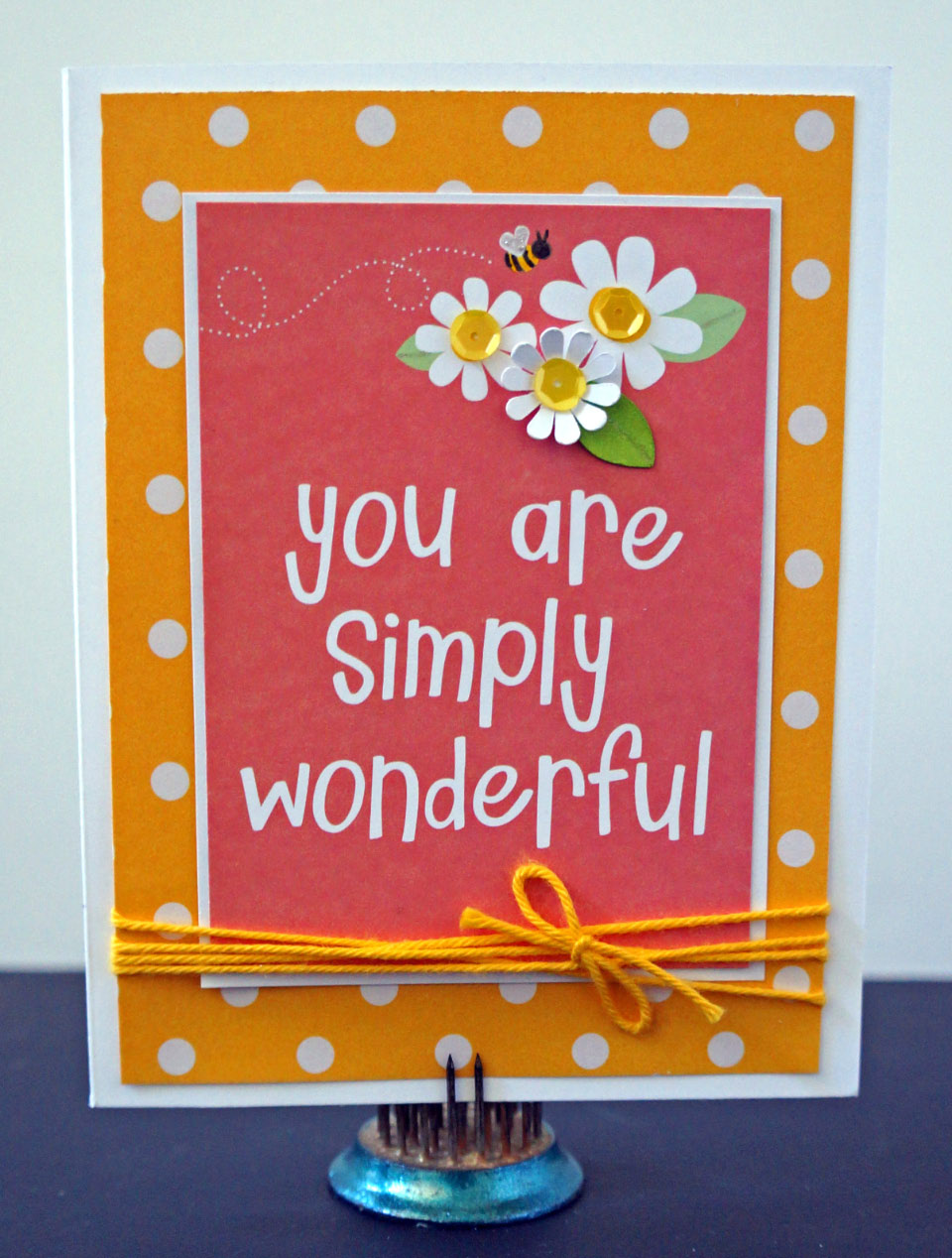 The first one that I made was this adorable “you are simply wonderful” card from Pebbles. It’s almost that this little filler card was made for a delightful greeting to brighten someones day! I added very little to this card. some background paper, a die cut flower that matched the flowers printed on the card, a few sequins, some yellow string, and some detail on the bee with my glitter pen.