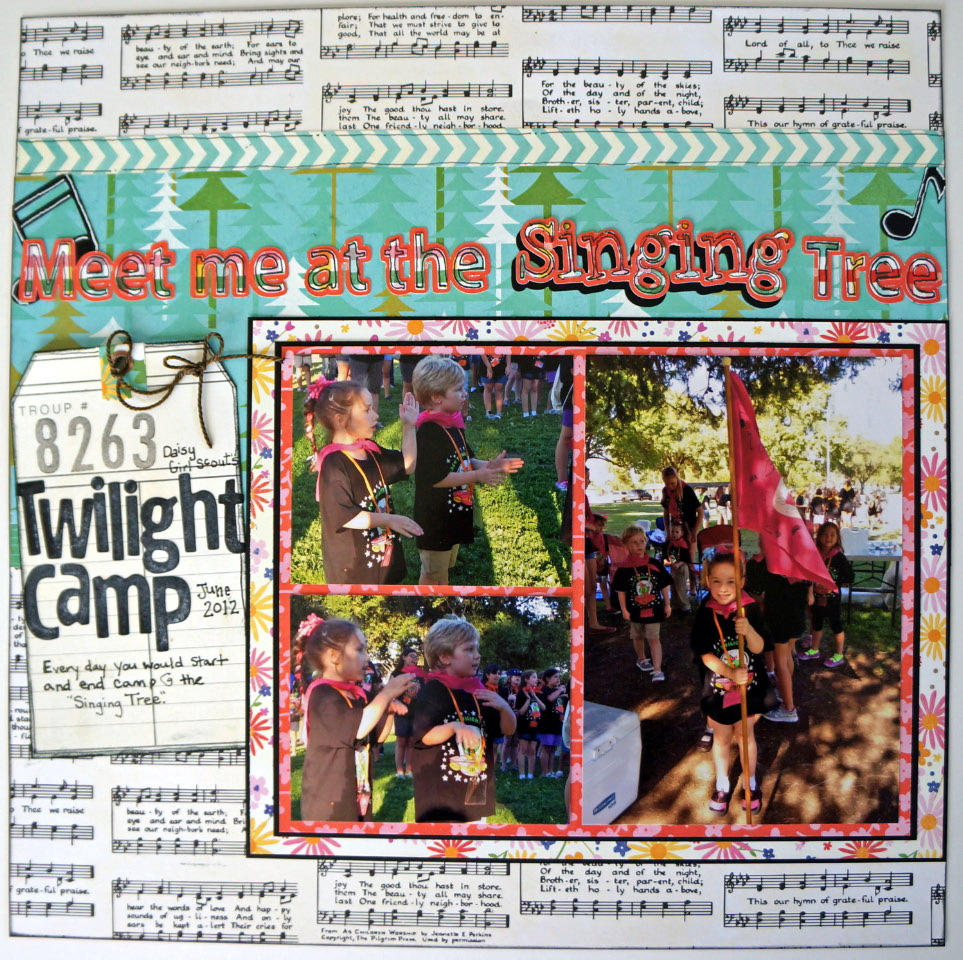 For a different look on this next layout, I used the same Lakeside line but pulled more of the floral papers and the sheet music paper as a background. It was the sheet music paper in this line that inspired me to create this layout in the first place. It worked perfectly for a girl scout camping photo of my daughter at the “singing tree”. I really wanted to pop the floral patterns in the paper so I matted each on black cardstock. The title was done on the silhouette as well as the music notes. To get the outline effect of the title as well as the shadow piece on “singing” I used the offset option in the silhouette software.