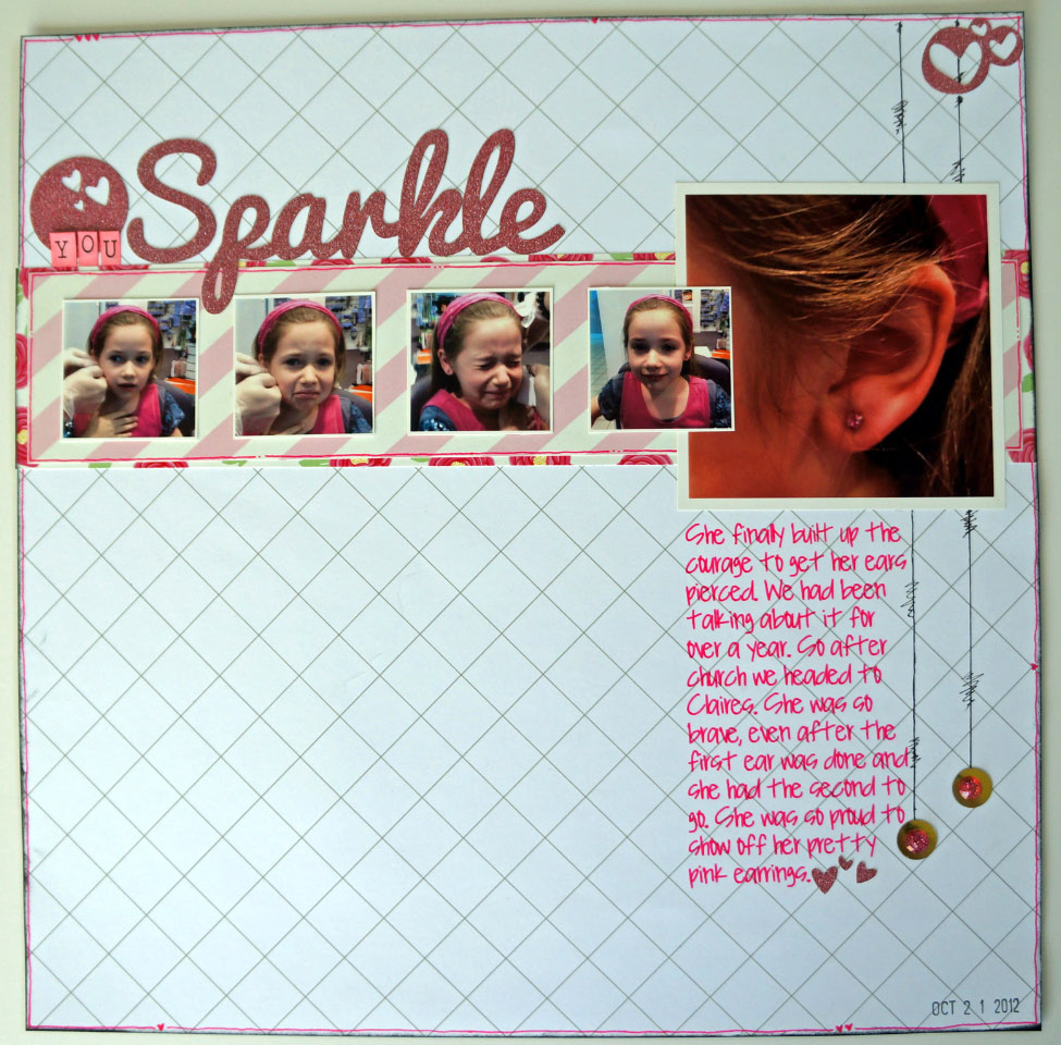 Next my little girl really wanted me to put her ear-piercing experience in her album (she was scared at the time but now loves to show off her *bling* and loves looking at these photos.) I created another simple quick layout using some American Crafts Mayberry papers and some American Crafts POW glitter paper.