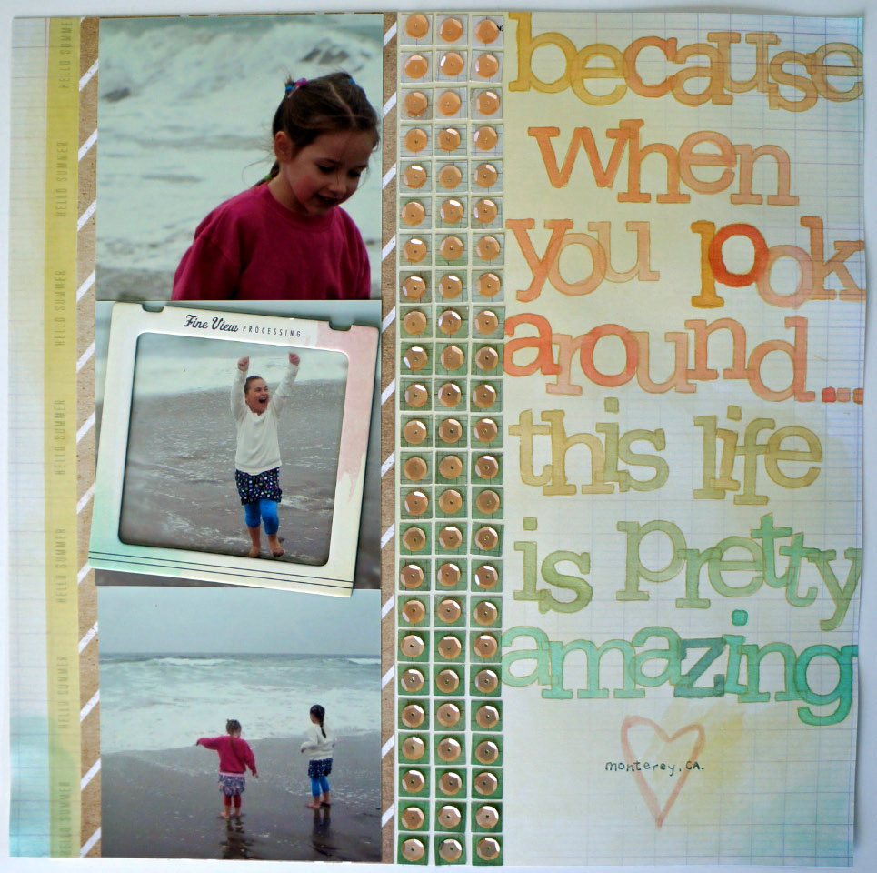 I was stuck for a while after working on the sequins portion and then last night at 2am I remembered a layout that I saw from April Foster that used the amazing Noah alpha stamps and the watercolor effect she used.(Yes I wake up in the middle of the night and think about scrapbooking, don’t you?) I shortened the popular quote by a couple of words to make sure it all would fit and I painted in the letters using three different colors of Mister Huey’s (Cameo, Shell, and Dewey) I mixed in a little bit of the shell color with the other two colors to give each letter color variation. I was really happy with how it came out.