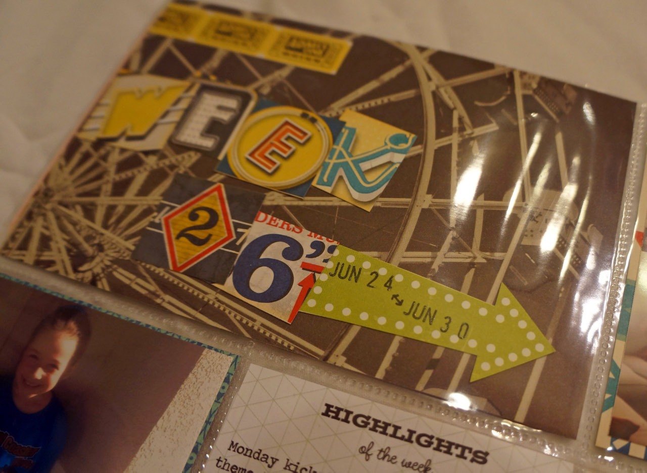 Project Life week 26 @thecraftypickle.comFor the title card I used elements from the different midway pattern papers and cut them up for a cute title and accent date arrow. It’s hard to tell in the photo but I took my clear glitter pen and added a little sparkle around the letters.