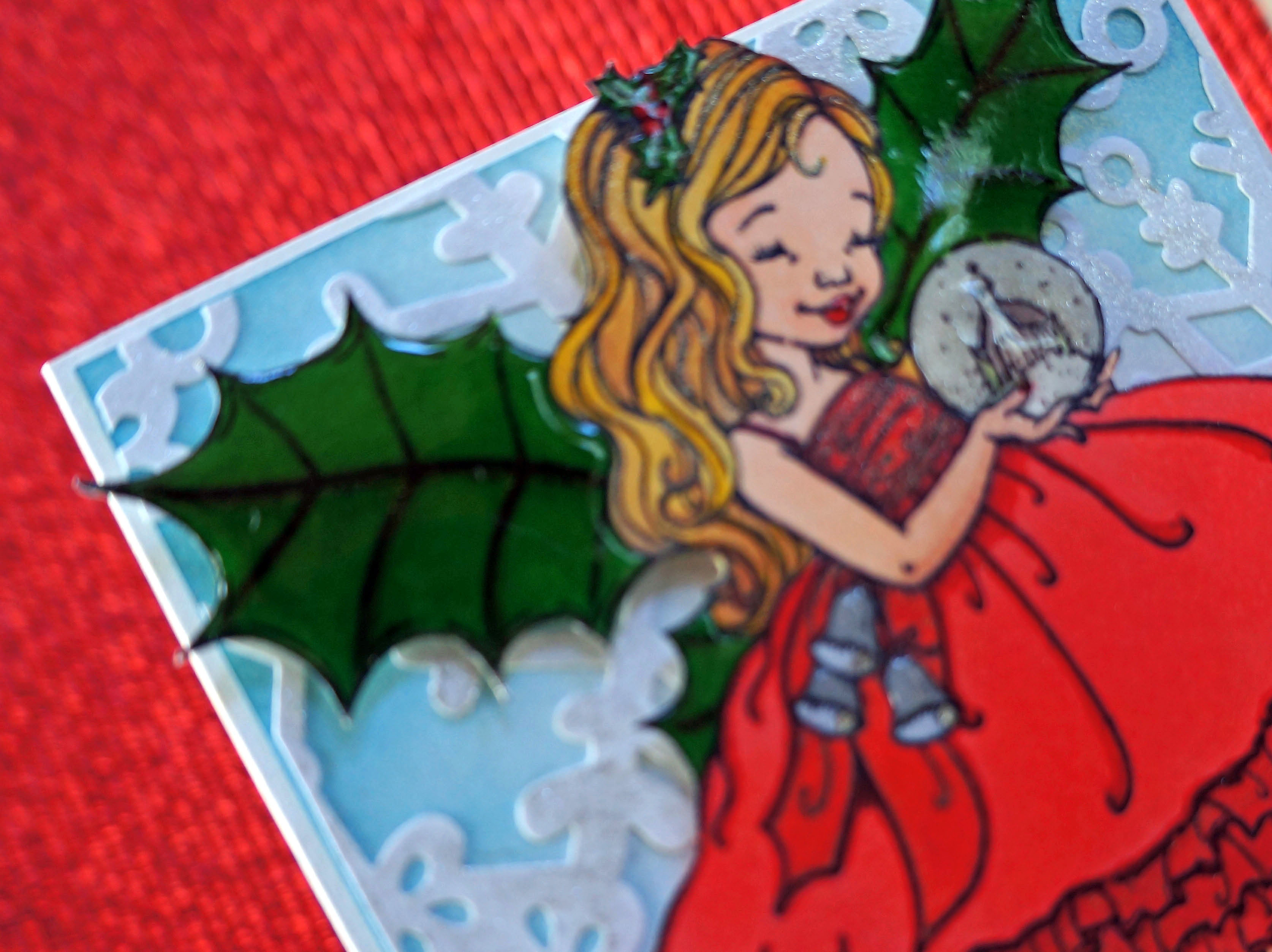 I started with layering the colors on the stamped image until I was happy with the shading and color. I took my wink of stella clear glitter brush marker and added some glitter here and there as well as my Copic Spica Atyou clear glitter pen for finer details. After all the glitter was done I took some Close to my Heart Liquid Glass and added a layer of that to the snowglobe, the holly wings, the hair holly and berries and the bells hanging from her waist. I did add one additional layer of the liquid glass on the snow globe so it would give more dimension.