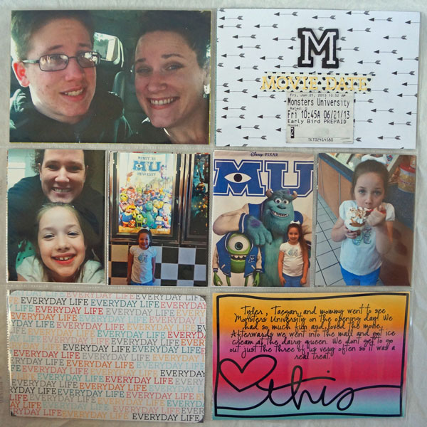 The bottom right card in the photo above was from the digital glitz collection. I used a Ali Edwards 4×6 outline brush on top and the journaling. It’s hard to see from the photo but the upper right card says Movie Date on top of the Glitz designs heart washi tape.