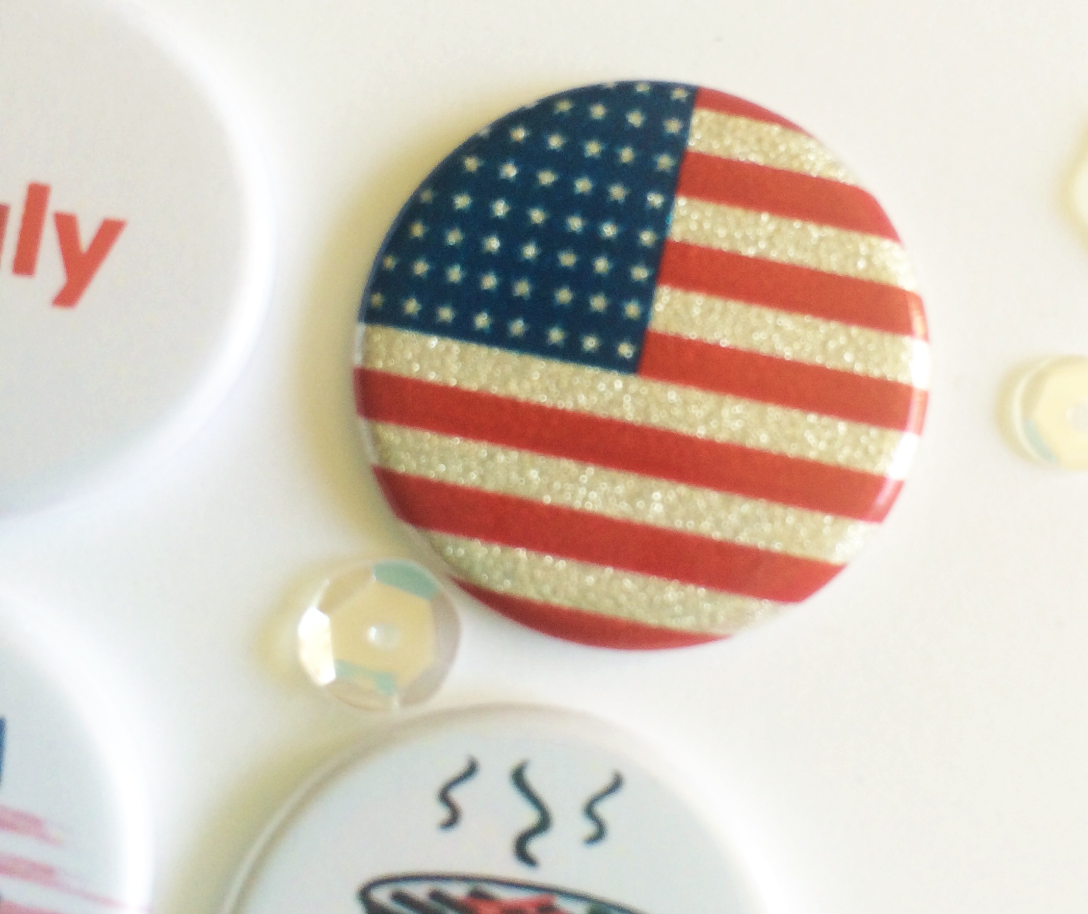 Monthly flair sets including this one for July. The flag flair is made with real glitter!