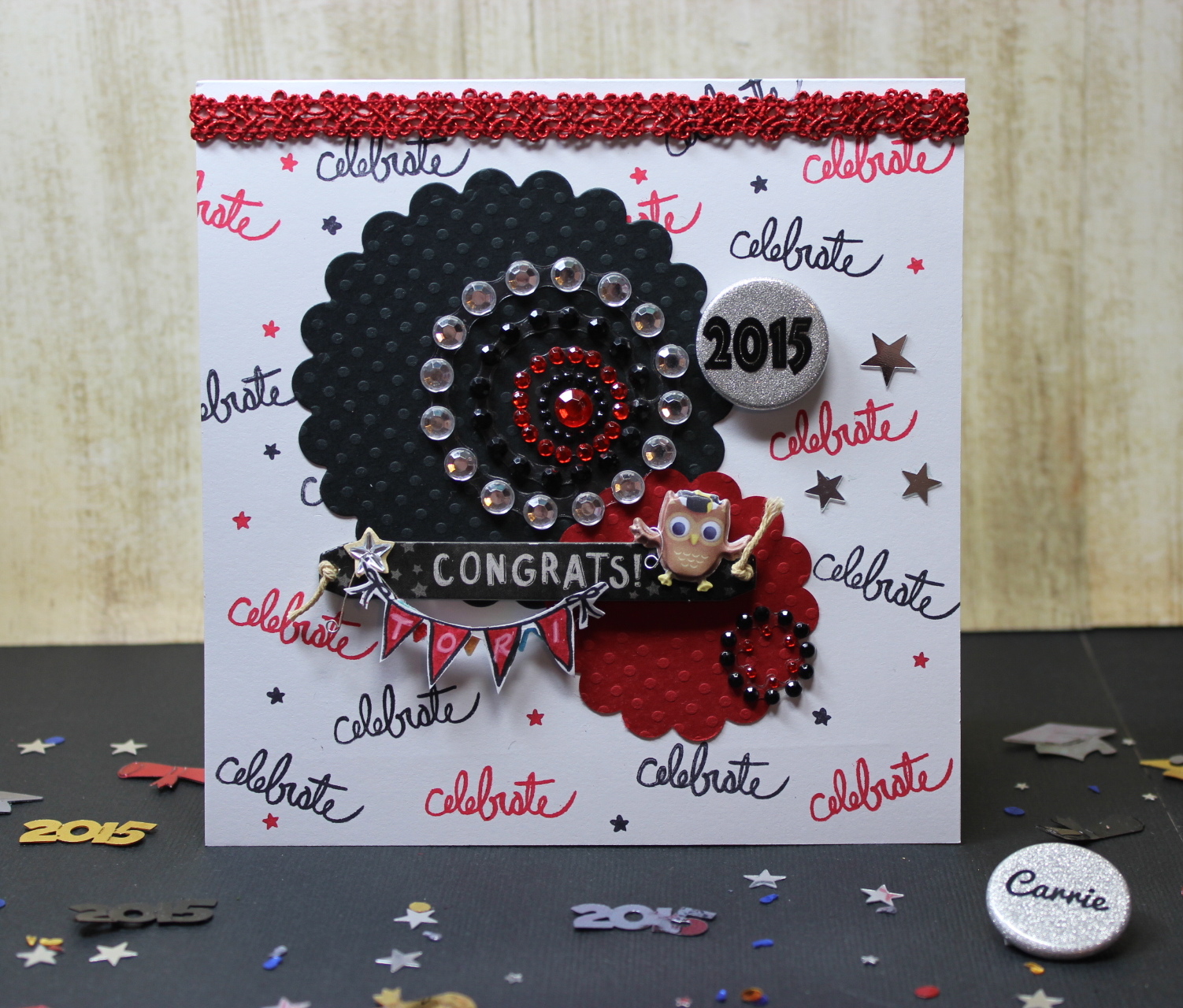 Switching it up a bit I also needed to make a card for one of my good friends daughter who’s school colors are Teal, black and white. For this card I stamped the sentiment “Celebrate” also from the “Life Right Now” Stamp set from HoneyBeeScraps. I embellished this card with some sparkle and another TCP flair from the Graduation set.Lastly I needed an 8th Grade Promotion card. This one is a bit cutesy. I had this cute 3D Owl embellishment from Jolee’s Boutique, it had a little colorful banner already attached but I wanted to add my nieces name Tori, so I stamped out the little banner from the “Not Too Shabby” stamp set. I then fussy cut it out and colored it in with a red marker. To personalize it I added her name with a white paint pen. I love the way it turned out. I also created the background on this card by repeatedly stamping the word celebrate and some tiny stars in red and black ink. These are stamps from the “Life Right Now” set. The tiny icons in this set are perfect for this technique. To complete my card I added a 2015 TCP flair and a few star sequins.