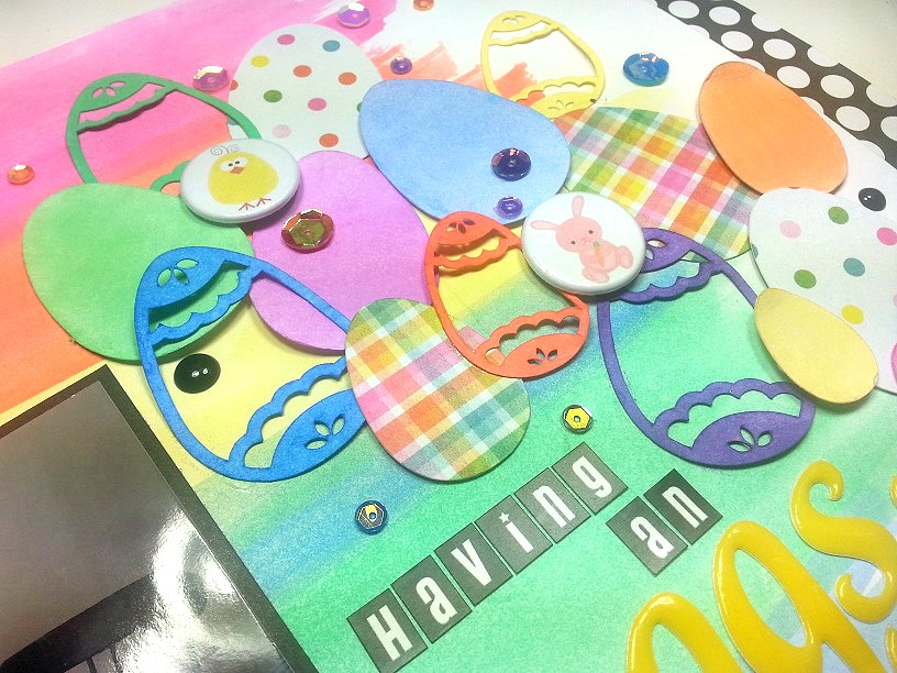 I watercolored some eggs and placed them where I thought they looked nice, glued them down and finished it off my adding my picture, the title, Spring Fling sequins, and Easter flair.