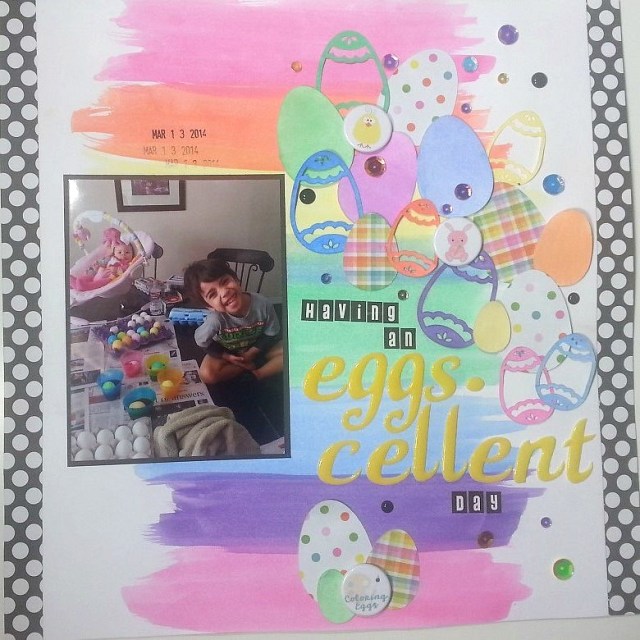 I fell in love with this layout and I had the perfect picture of my little ones to recreate it but also make it my own! I used some watercolors to create by background and added a couple of paper strips to the sides to add a little something to this colorful layout. I used CTMH Art Philopsophy cartridge to cut all of my eggs out of white card stock and some pattern paper.