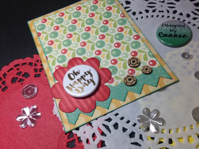 I am part of a group on facebook that creates and swaps handmade Project life style cards and embellishments. You can find us here – Projectlifecardswaps.com Our own Taniesa is one of the hostess in our group. She hosts a new swap every month called JAF – Just Add Flair. For this swap we are to create a 3×4 or 4×6 PL card with a spot for the receiver to add a flair button.