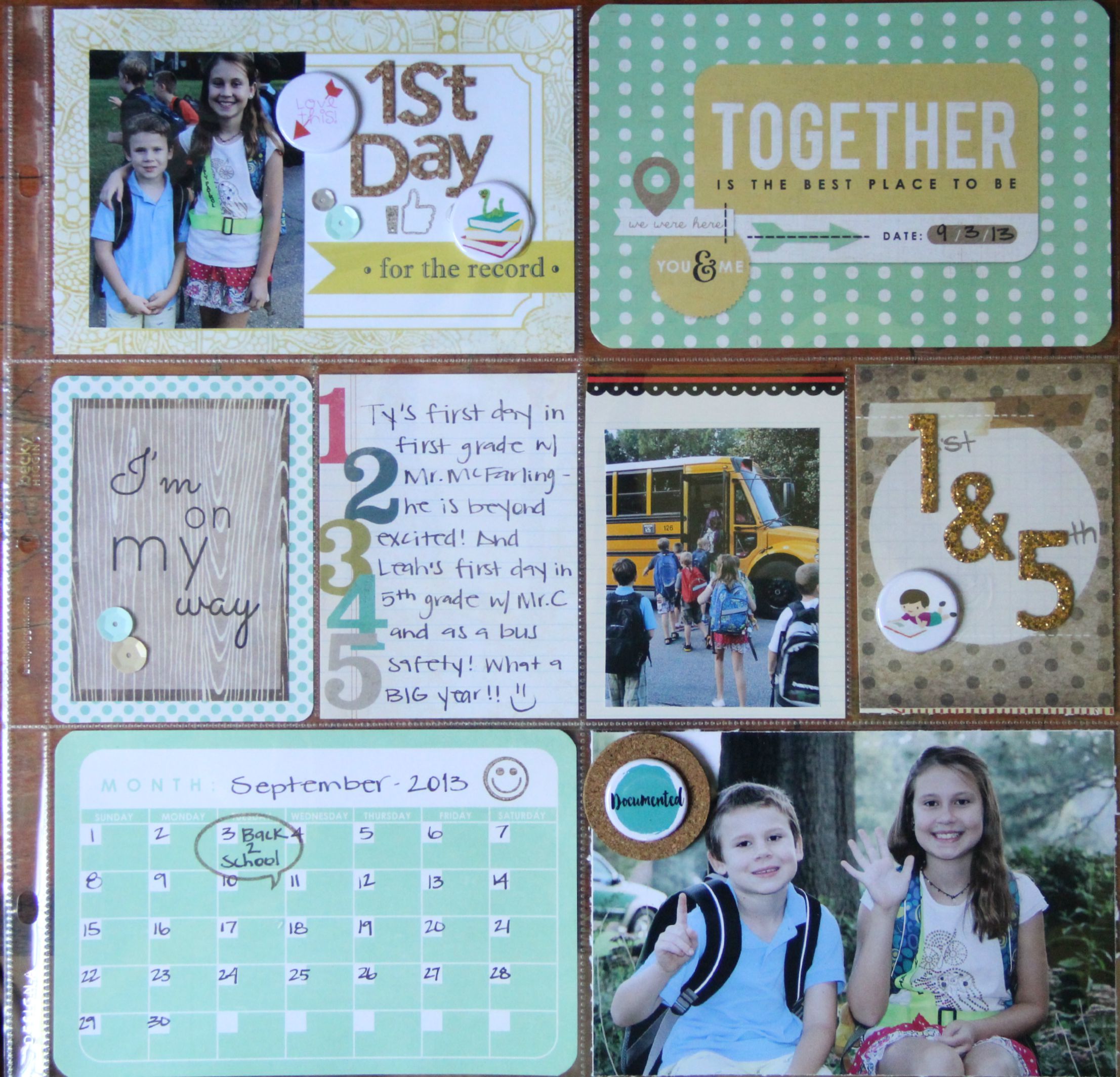 Hi Crafty friends! It’s Stephanie here today to share a layout that I created in the PL style. My kids just went back to school last week, so in honor of the big day, I made a 1st day of school page! (Granted, the photos are from two years ago-but they’re now scrapped!)