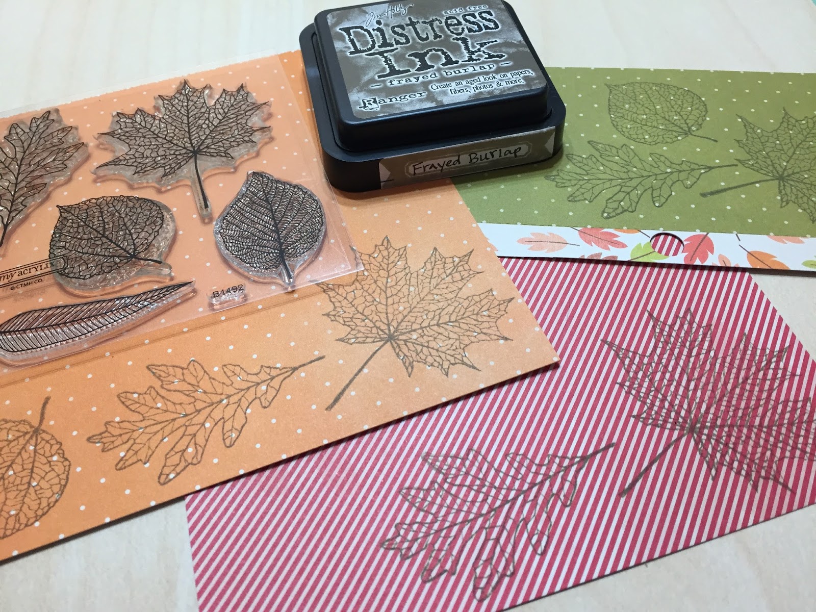 To create the background on my cards I tore strip of paper from several different patterns, I inked all the edges in Ground Espresso Distress ink and using my Tombow liquid adhesive I glued the pieces, layered on top of each other onto a 4×6″ sheet of Kraft cardstock.