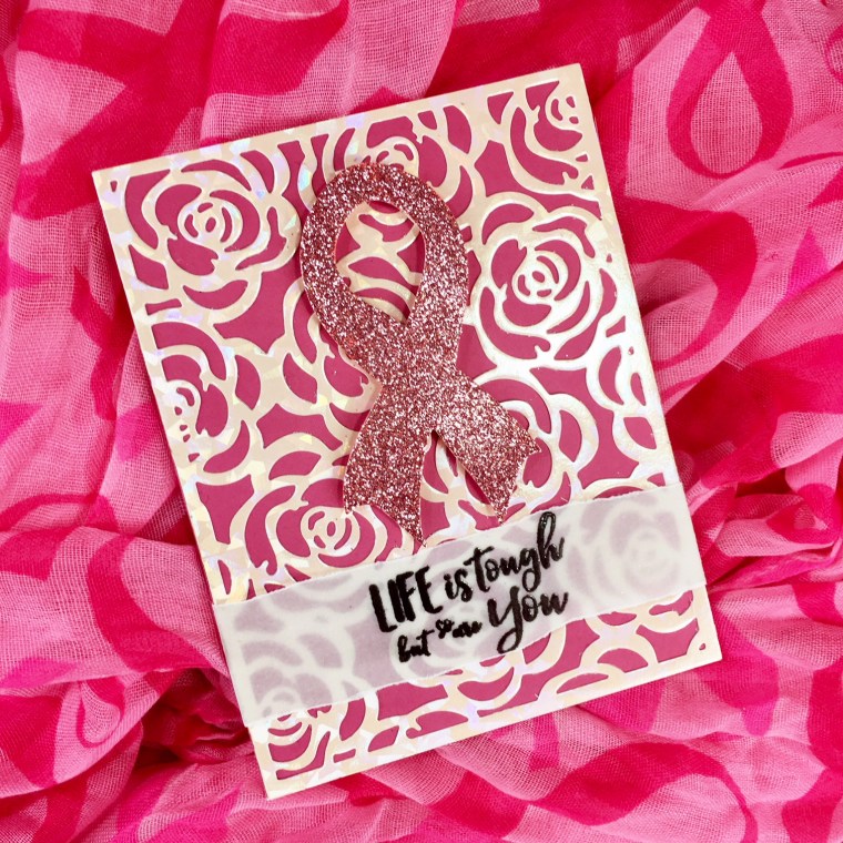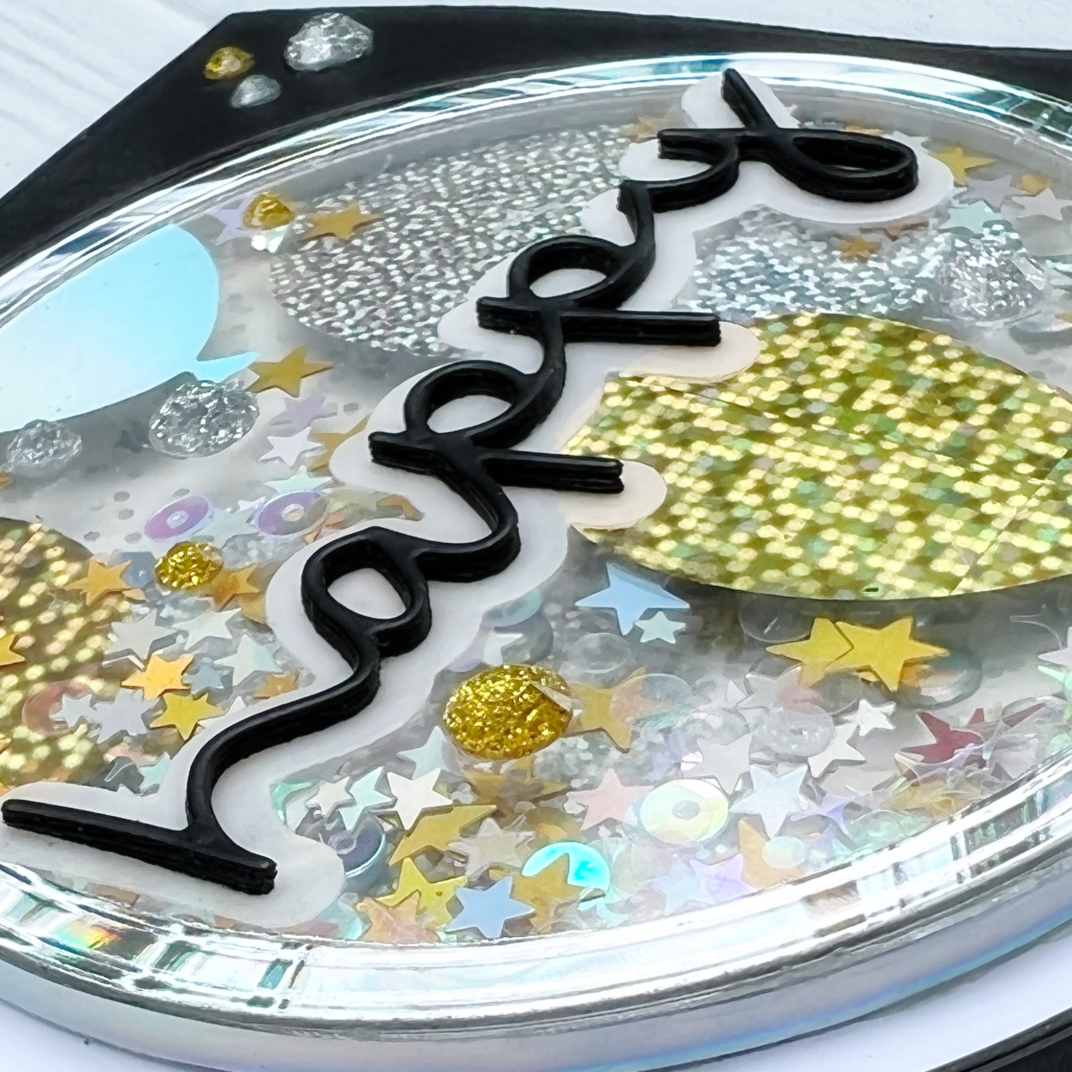 Because this circle stack was so thick and I didn’t want the foam tape showing on the side, I cut a thin strip of holographic paper to wrap around the outside. I also cut a circle frame out of holographic cardstock using the Trinity Stamps Modern Embossed Circle Stack Die Set to layer on top.