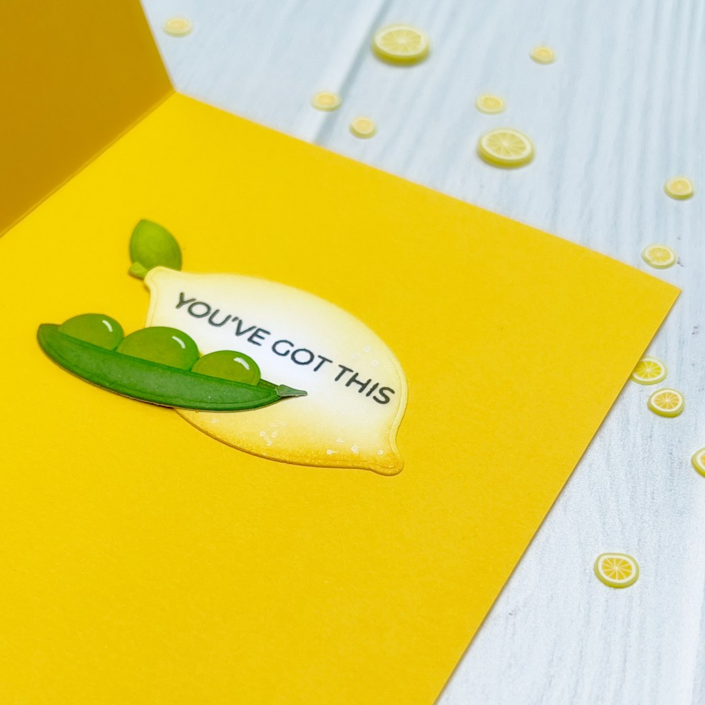 I heat embossed the sentiment with white embossing powder and used my watercolors to paint the inside and outside of the sentiment. I cut it out using the coordinating die set as well as the bonus lemon and pea pod dies for the inside of the card. I used the Lemon and Leaves stencil set to create the background behind the sentiment cut out. The sentiment on the inside, “You got this”, came from the 4×8 A sentiment for almost everything stamp set. I really love the blue and the yellow together with the added pop of the green, don’t you?