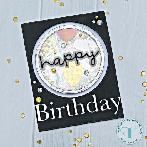 I cut out several balloons from the Celebration Balloons Die set and then I added the letters for HAPPY using the Trinity Stamps Graham Cracker Alphabet Die Set cut out of gold glitter cardstock. I cut the Swirly Birthday sentiment out of the same gold cardstock as well as each of the colors I used for the balloons.