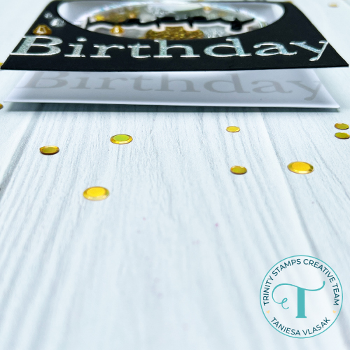 I added the word Happy from the Simply Sentimental: Happy Coordinating Die set (stacked three layers) along with the shadow layer in vellum. The bottom Birthday sentiment was cut out of the same holographic cardstock using the Simply Sentimental: Birthday Coordinating Die Set.