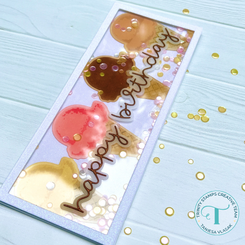 For this card I used my distress oxide inks and the Little Layered Ice Cream Cone stencil (and coordinating die) to make some yummy ice cream cones. I cut out the ice cream cones and layered them on some white glitter cardstock. I had to trim the bottom of the cone just slightly to fit. I cut out a frame using the Slimline Modern Embossed Die Set from the same white glitter cardstock and used that to make a shaker front. For the confetti I used the new Seashore confetti mix along with Strawberry Ice confetti and Rock Candy Confetti. The Happy sentiment is from the Simply Sentimental: Happy Coordinating die set and the Birthday is from the Simply Sentimental:Birthday coordinating Die Set