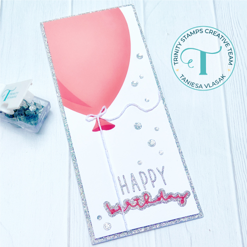 I made this quick slimline birthday card using the new Slimline Swirly Birthday sentiment and some balloons from the new Celebration Balloons die set. The background was made using the Trinity Stamps Puffy Cloud stencil and some Tumbled Glass distress oxide ink. Once the ink dried on the background I sprayed some shimmery glitter spray from my stash.