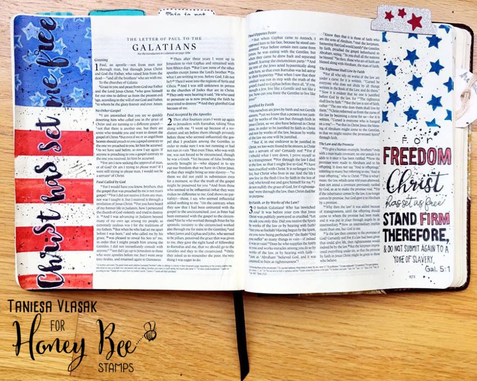 Happy 4th of July to all of my American friends out there. Today I am wrapping up red, white, and blue week with my final project for Honey Bee Stamps. Today, rather than do a card, I thought I would share with you an entry I did in my journaling bible. Maybe even give you a few tips that might help you in your bible/art journaling. I also want to mention that there is a sale at Honey Bee Stamps today 7/4/16. 15% off your total purchase by using the code 15FREEDOM (this is on top of the sale prices listed).