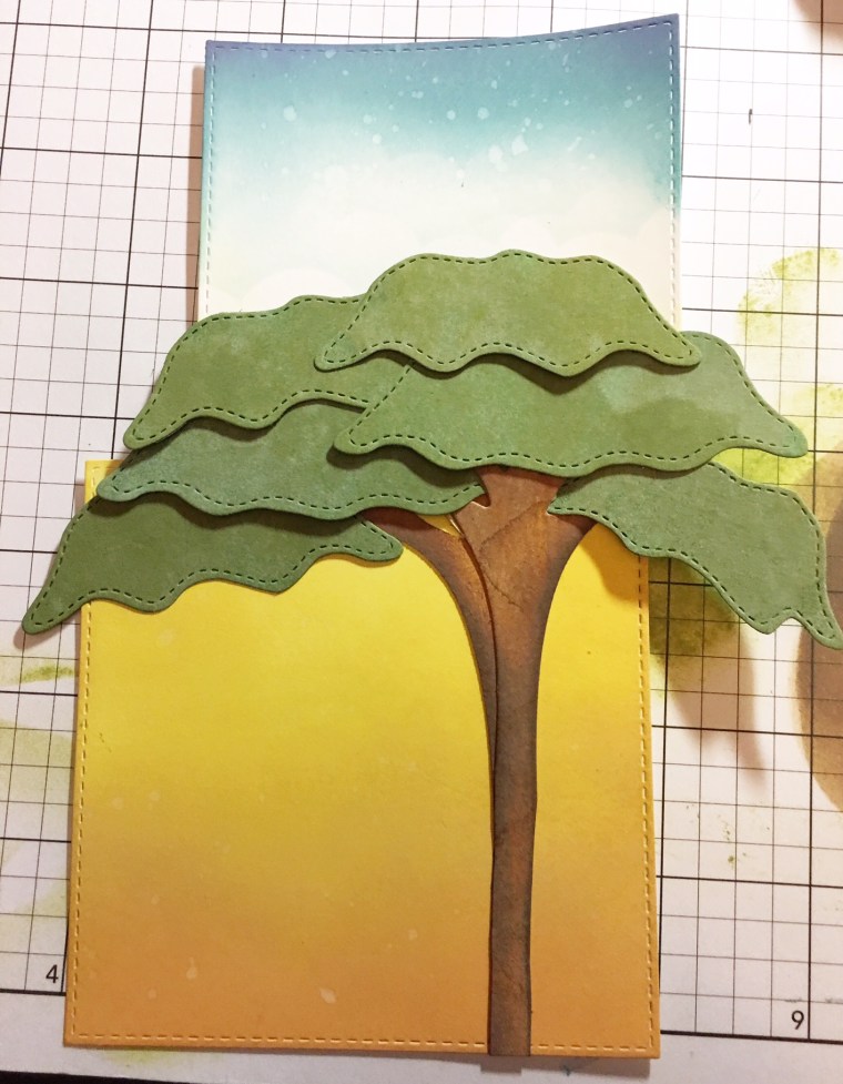 I had made a green background by blending some various shades of Distress Oxide ink and then to make a floor to ground our character, I blended some ink into cardstock then ran it through a WRMK woodgrain embossing folder. I tried doing this with markers and drawing the floor in but it was taking away from my wizard scene too much so this was a much more subtle option.