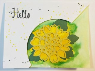 Lastly I took the front piece of cardstock that I started with and stamped a simple hello sentiment and splattered a bit of mist in yellow and green on top. I added the piece to the card base using foam squares.