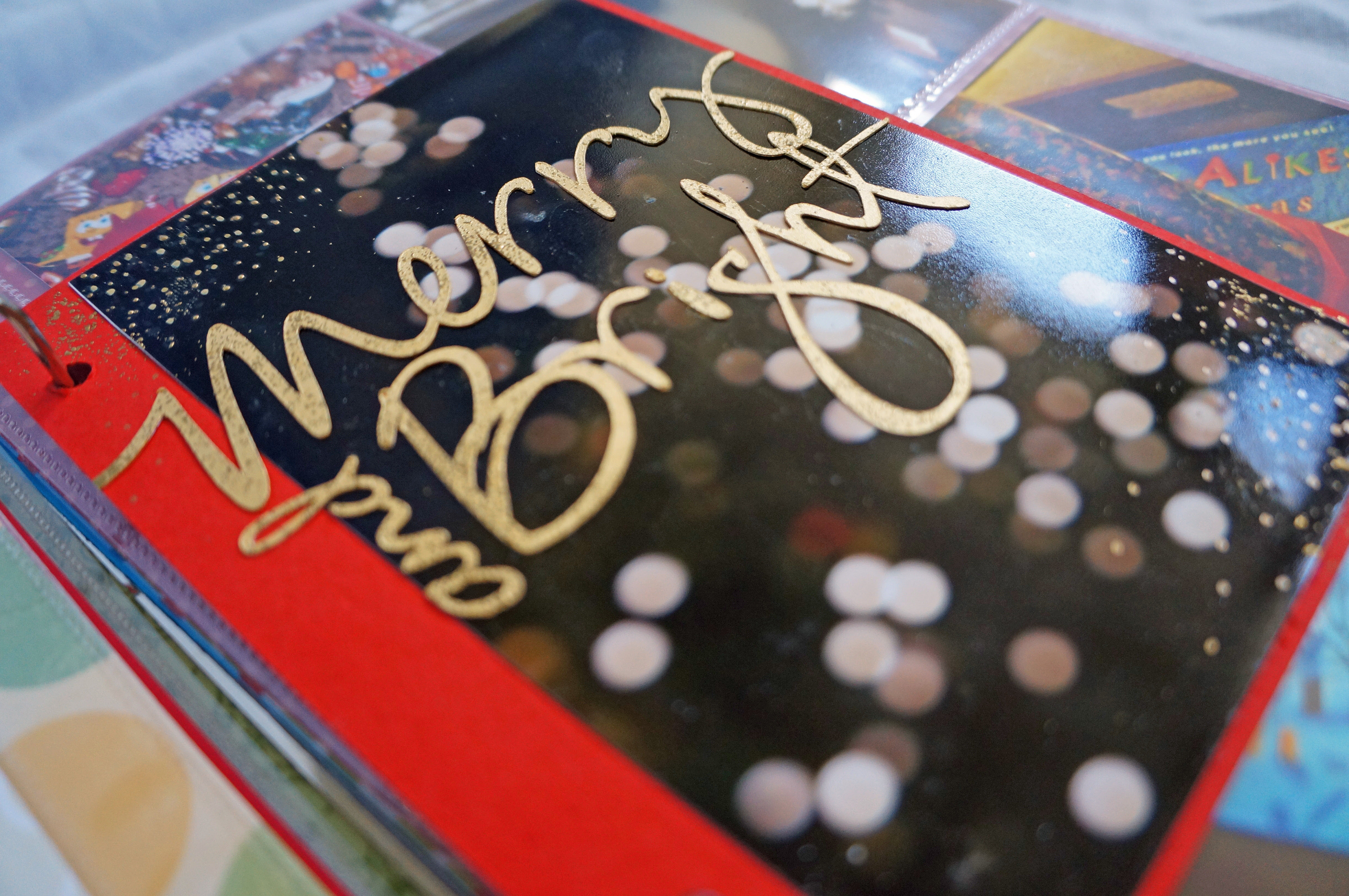 The letters that spell ELF and SHELF were cut out using the silhouette as well as lots of the other die cuts on this page and other pages within the album. What I did differently with these though is that I took a Brilliance Gold mini ink pad and dabbed it all over the letters, I let it dry for a little bit (it stays wet for quite some time) and then I took some gold ZING embossing powder and sprinkled it on the letters lightly. I Heat embossed the letters and it gave it some added metallic shine and texture that I loved. You will see I repeated the technique a lot in my album because I loved the effect. In the photo it looks a little dull but in person its very shiney.