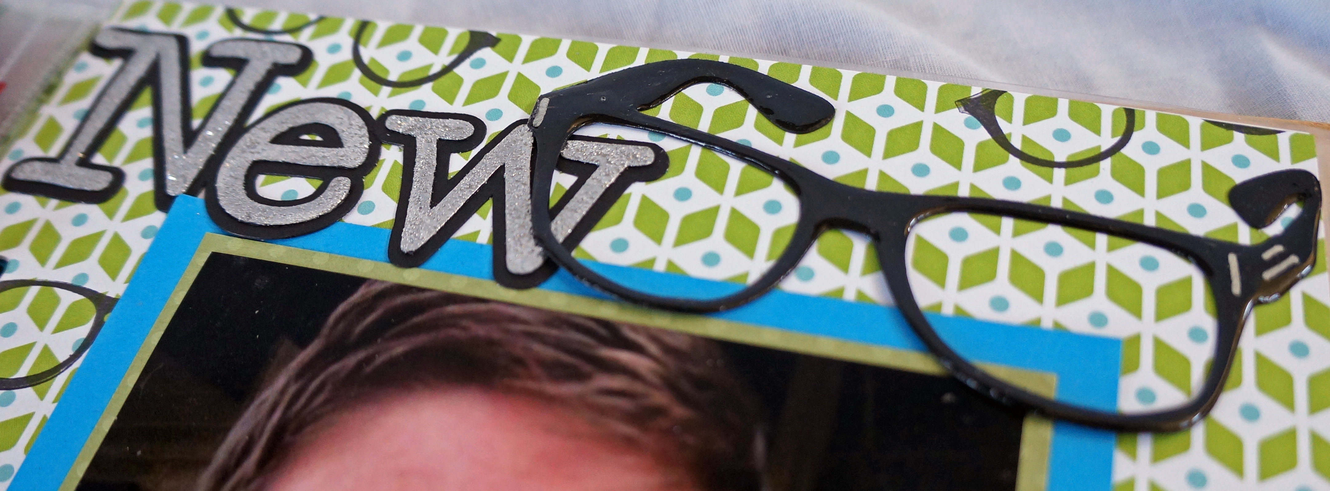 The glasses in the title were cut with the silhouette. The other glasses were stamped using a brand new release stamp from close to my heart *bonus sneak peek* . For the title “NEW” I cut one set and a shadow set from the silhouette. I dabbed platinum ink on the top letters and covered it with silver glitter ZING embossing powder.