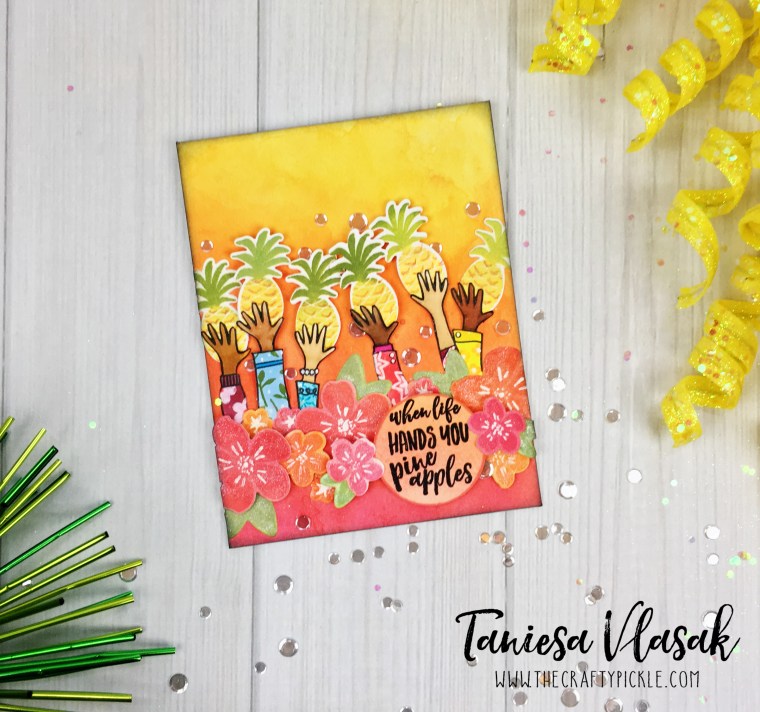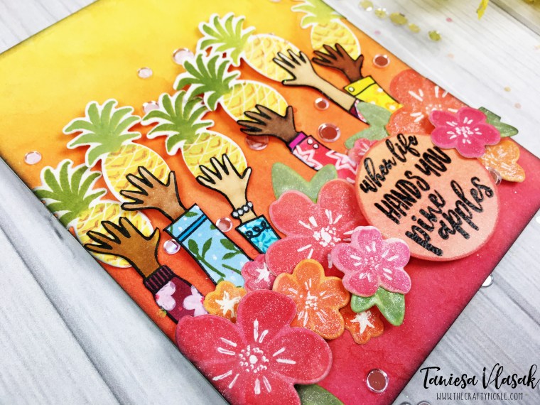 I stamped and colored the hands border stamp from the Avery Elle Hats off stamp set with my copic markers. I stamped or drew on some accents that reminded me of hawaiian print shirts. Some patterns I accented with my white signo gel pen. I added a little foam tape behind the hands and the pineapples to make it look more like these hands were actually holding a big pineapple. I took a little Black Soot Distress ink on a ink blending sponge and lightly brushed the edges of the panel to give a vingnet look.