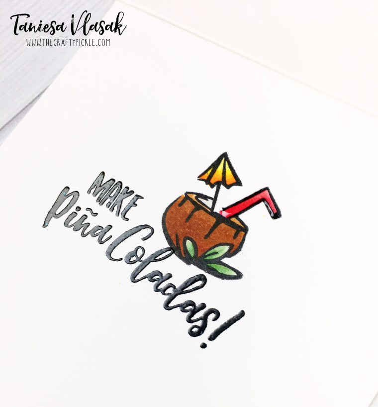 The drink filled coconut is from the “Stay Cool” waffle flower stamp set which I stamped and then colored with copic markers. I added a little Glossy accents on the straw to make it look like a shiny plastic straw.
