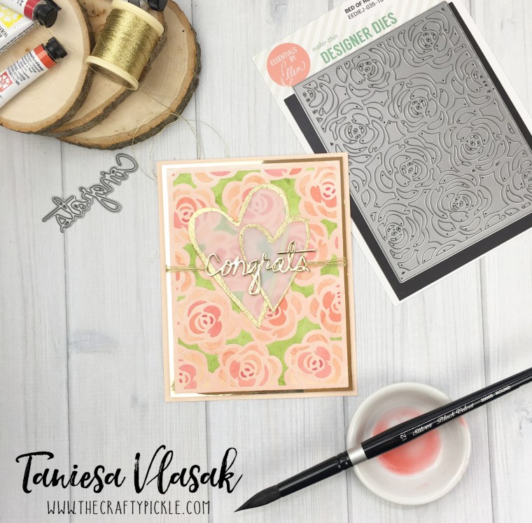 The next card was inspired by the beautiful florals in the photo as well as the gorgeous “Bed of Flowers” Essentials by Ellen die. I had several pieces of watercolor paper that I was practicing watercolor washes with. Not wanting them to go to waste I thought I would cut them up with this beautiful die and piece them back together on a piece of cardstock that I covered with Be Creative tape.