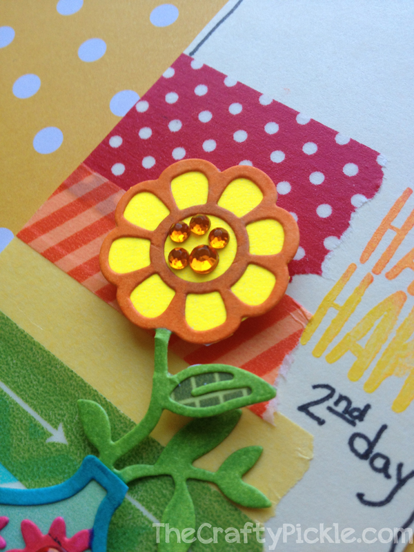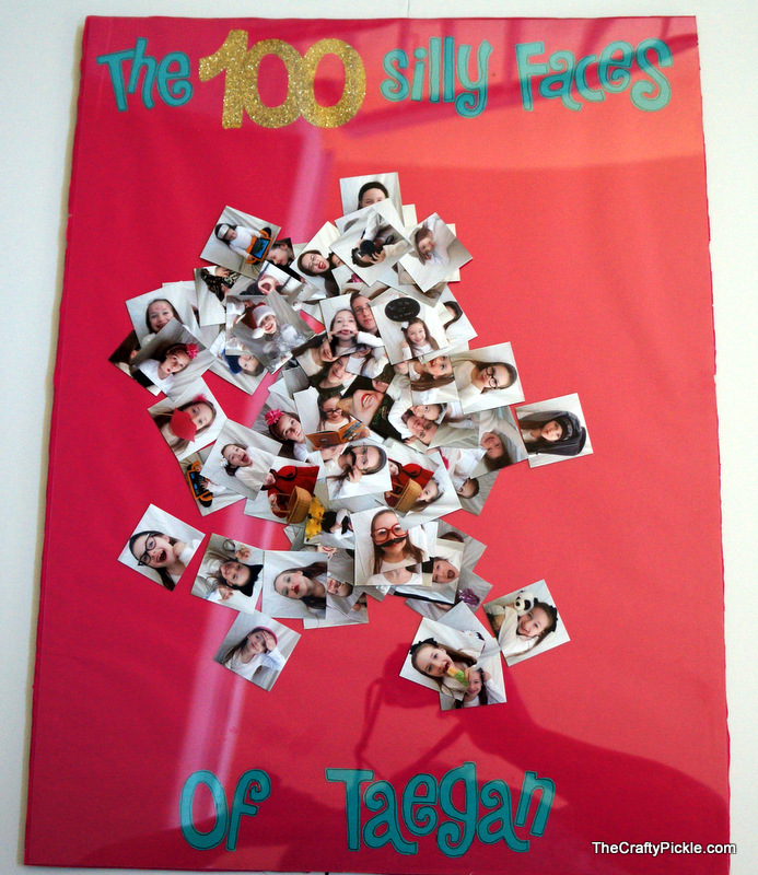 Step Three: Now for the fun part. Break out your camera, dig around your house for any sort of props you can find, crazy hats, red lipstick, funny glasses, scarves…. anything at all, definitely get your child involved in this as they have fantastic imaginations! take a neural colored sheet or big piece of fabric and drape it over some kinda surface, we used two tall chairs to hold the sheet up. Then let the fun begin! Take lots and lots of photos, your going to need 100 but not all of them will make the cut so have them make silly faces, think of every emotion they could show on their face, give them hats and silly mustaches and see how they play to the camera. I used my iPhone 4s for all of my photos for the convenience factor…. then I grouped them in 4 to a photo using an app called Picframe. after I put them all 4 to a photo I printed them on my Canon Selphy CP900 wirelessly (seriously, the best little photo printer ever). Then I trimmed each photo down. I used my Silhouette machine to cut out the title (Stampin’ Up teal cardstock and American Crafts gold POW glitter paper)