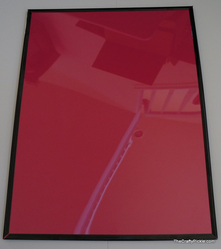 Step one: Pick up a poster frame at your local discount store (we got ours from target) and also a roll of wrapping paper in a solid color (my daughter chose Pink, big surprise there)