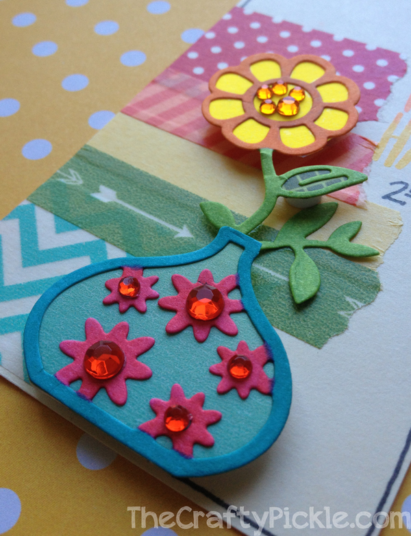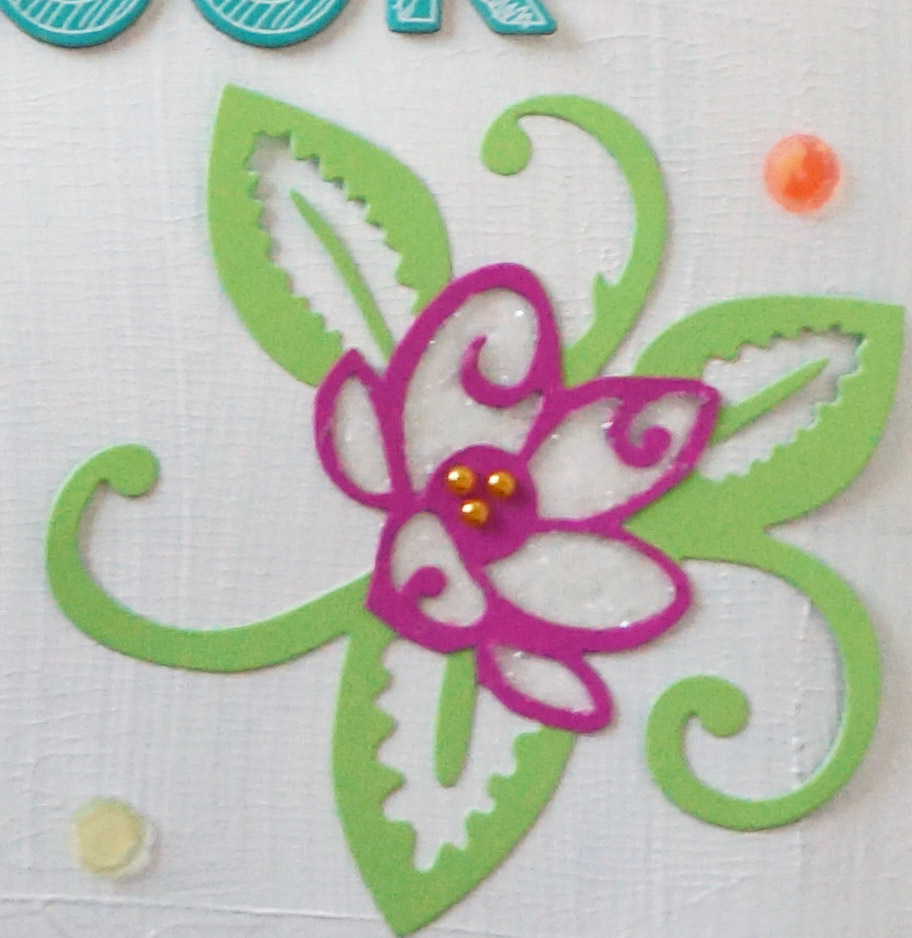 I misted the top left corner with Mister Huey’s in the color Desert over a mask and then I accented with some of the beautiful sequins you can find in the Whimsical Twist Shop. I also used a mask and some ink to create a bubble confetti background on the bottom using CTMH Lagoon ink and then layered with some of the same beautiful sequins from the shop. The two colors I used are Pineapple and Caribbean. I adore these beautiful sequins so much, I think I may even use them more than my enamel dots! To adhere the Sequins I used the same Liquid Glass that I used on the title letters.