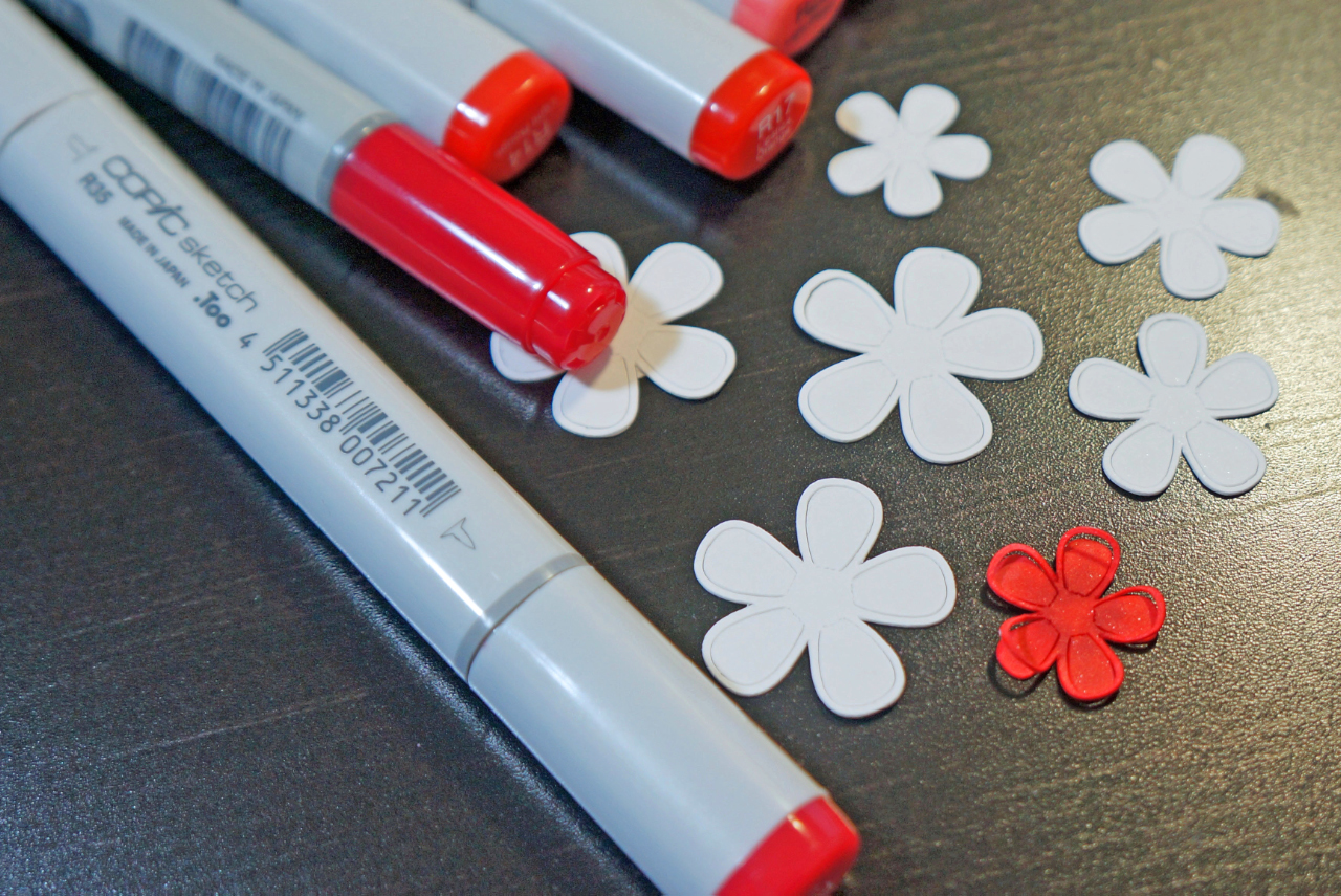 While your ink is drying go ahead and prep everything else. Cut out your flower of choice on your die cut machine. I took one flower that I liked and made a bunch of copies of that flower on my silhouette software workspace, I then resized them in three different sizes to add variation and interest. So go ahead and grab your markers, bring out your inner 10 year old and color away! I love coloring and having die cuts pre cut in white really speeds things up for me as I can make it any color I want. Be careful if you have chosen to use a water base marker as they can be streaky and can make your paper pill up. You could watercolor these as well for a soft beautiful look. I really wanted my flowers to pop and be the main focus so I chose shades of pink and red copic markers this time.