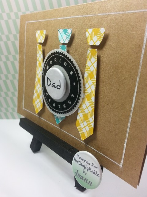 Using the same stamp set I stamped “World’s Greatest” on a 2 inch circle piece of vellum with some Versa Mark and used some black embossing powder and then placed a flair from TCP Family themed flair set right in the center. I finished the card by adding some foam adhesive to the tie’s and drew a white square to add a little something.