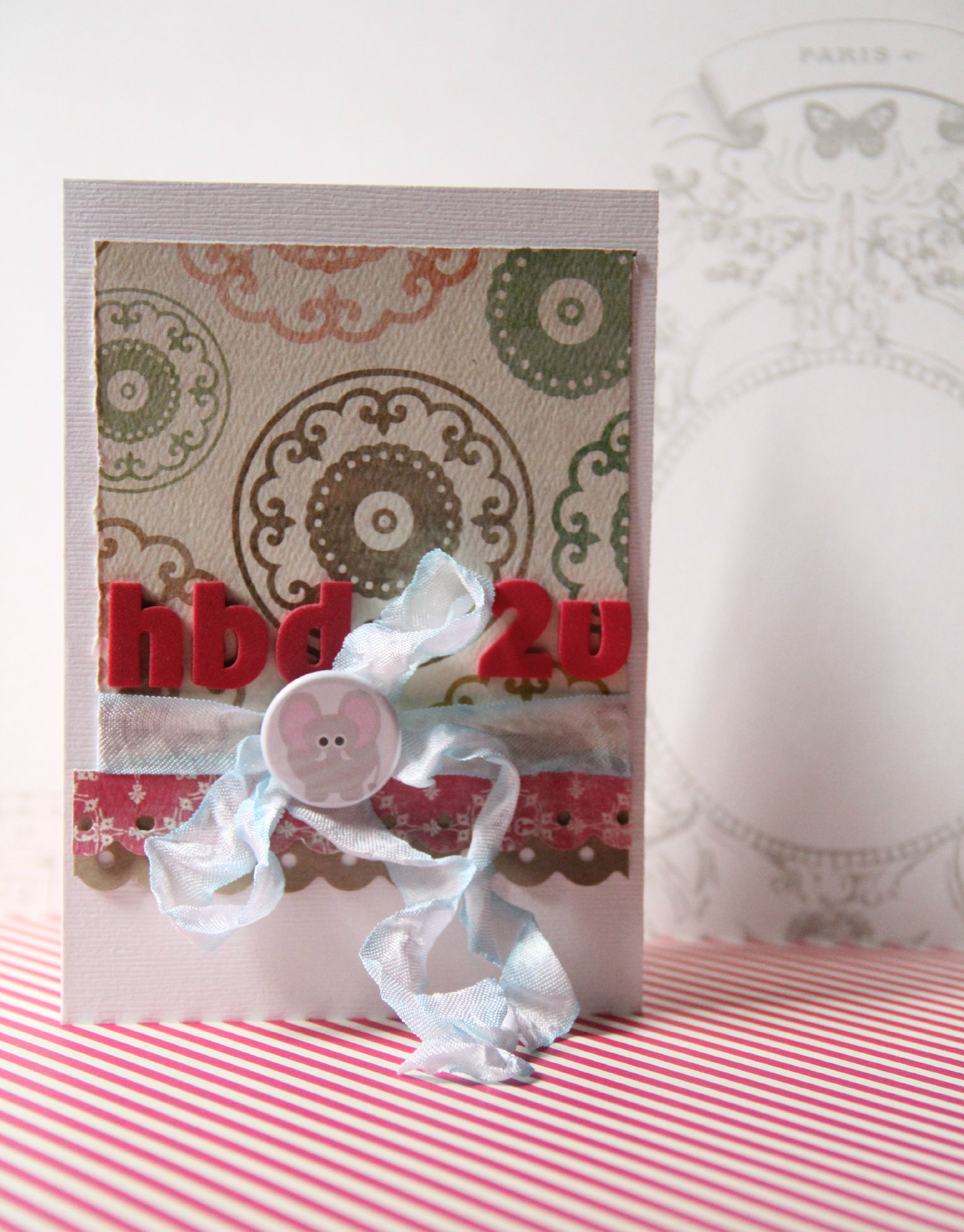 For the vellum sentiment strip I used some Essentials by Ellen heavyweight vellum and stamped the sentiment with versafine Onyx black ink. I sprinkled some clear embossing powder on top and heat set. The torn vellum strip is folded and glued down on the back side of the card base. Once completed I added the panel to a white card base.