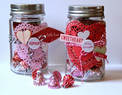 I filled the jars with a bunch of chocolate kisses, a chocolate heart & candy bar. I think their teachers will enjoy them-I know I would! Now I just need to make a few more before February 14th!!